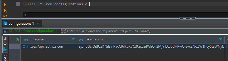- Para realizar esta configuración, accede a tu base de datos y localiza la tabla configurations. Asegúrate de completar las columnas url_apiruc y token_apiruc con los valores proporcionados para la API